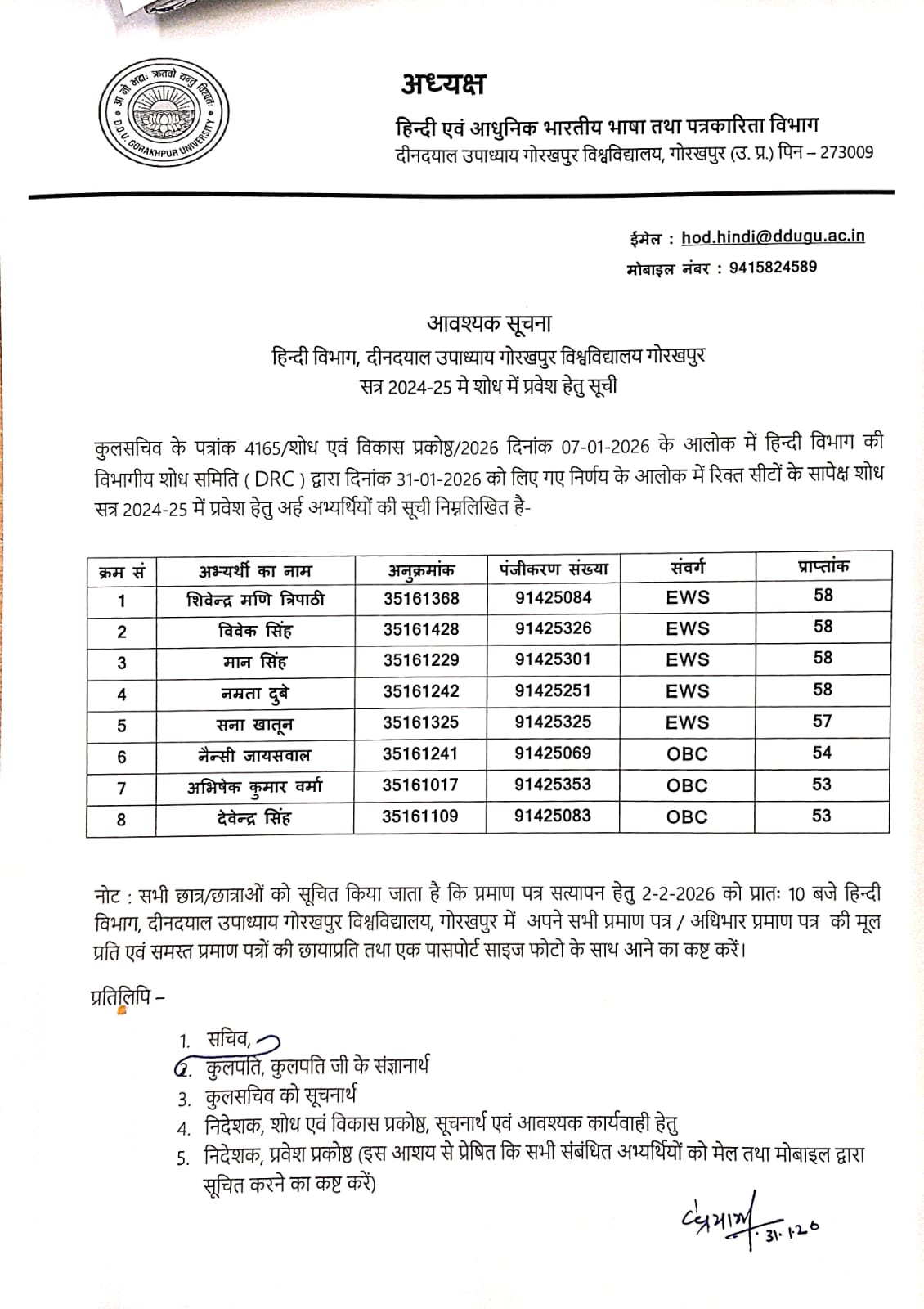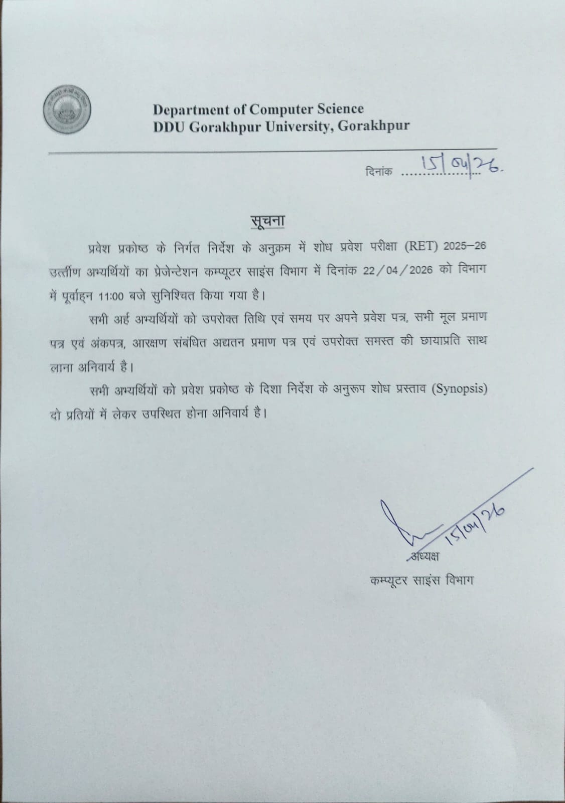 एम. ए. उर्दू में दाखिला लेने वाले सभी अभ्यर्थियों को सूचित किया जाता है कि प्रवेश की प्रक्रिया 18 जुलाई 2025 को पूर्वाह्न 11: 00 बजे से उर्दू विभाग, दीन दयाल उपाध्याय गोरखपुर विश्वविद्यालय में प्रारंभ होगी। इस पाठ्यक्रम में दाखिला लेने वाले उम्मीदवार अपने हाईस्कूल इंटर के मूल अंकपत्र/प्रमाणपत्र, आधारकार्ड तथा अद्यतन जाति व आय प्रमाणपत्र तथा सभी आवश्यक दस्तावेज की स्व हस्ताक्षरित छायाप्रतियों के एक सेट के साथ उपस्थित रहें।