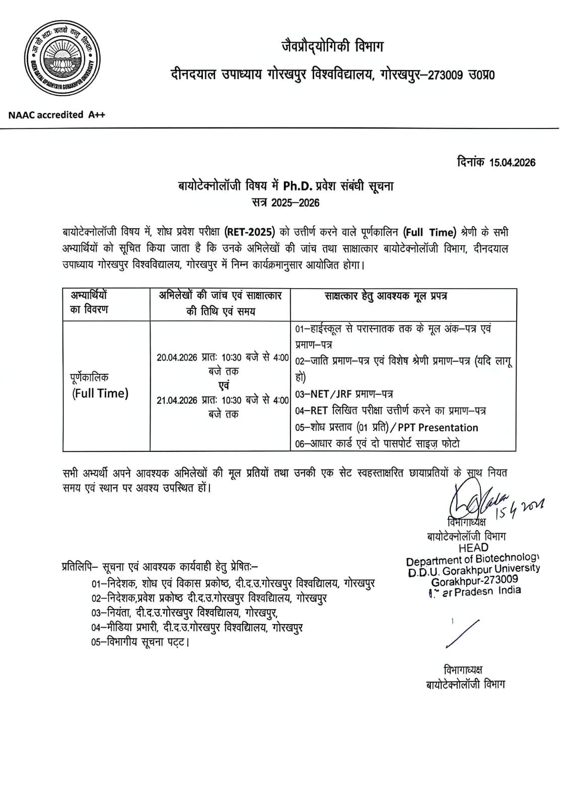 | 29 Sep 2025 - Notice for PhD Biotechnology | View |