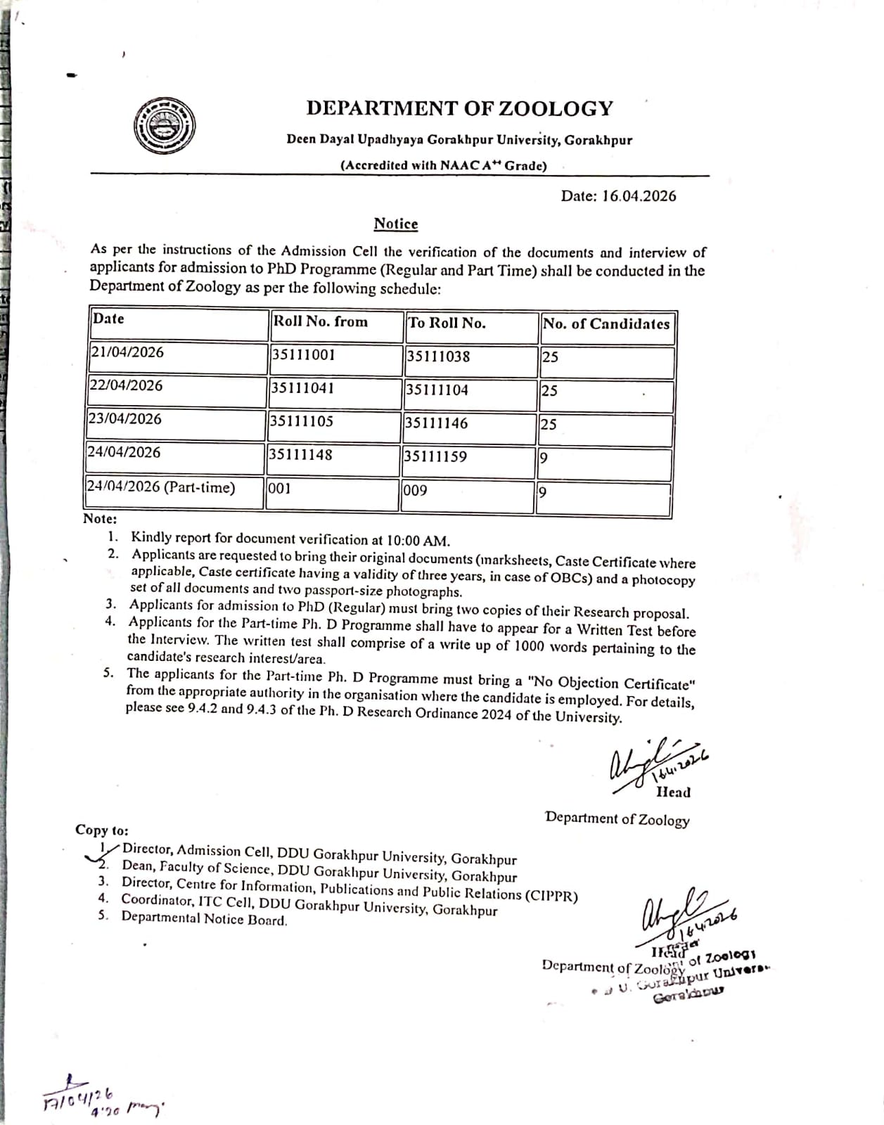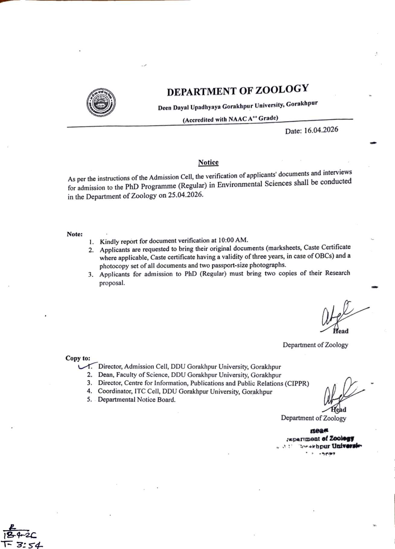 17 April 2026 - आवश्यक सूचना: for Ph.D. in Zoology
